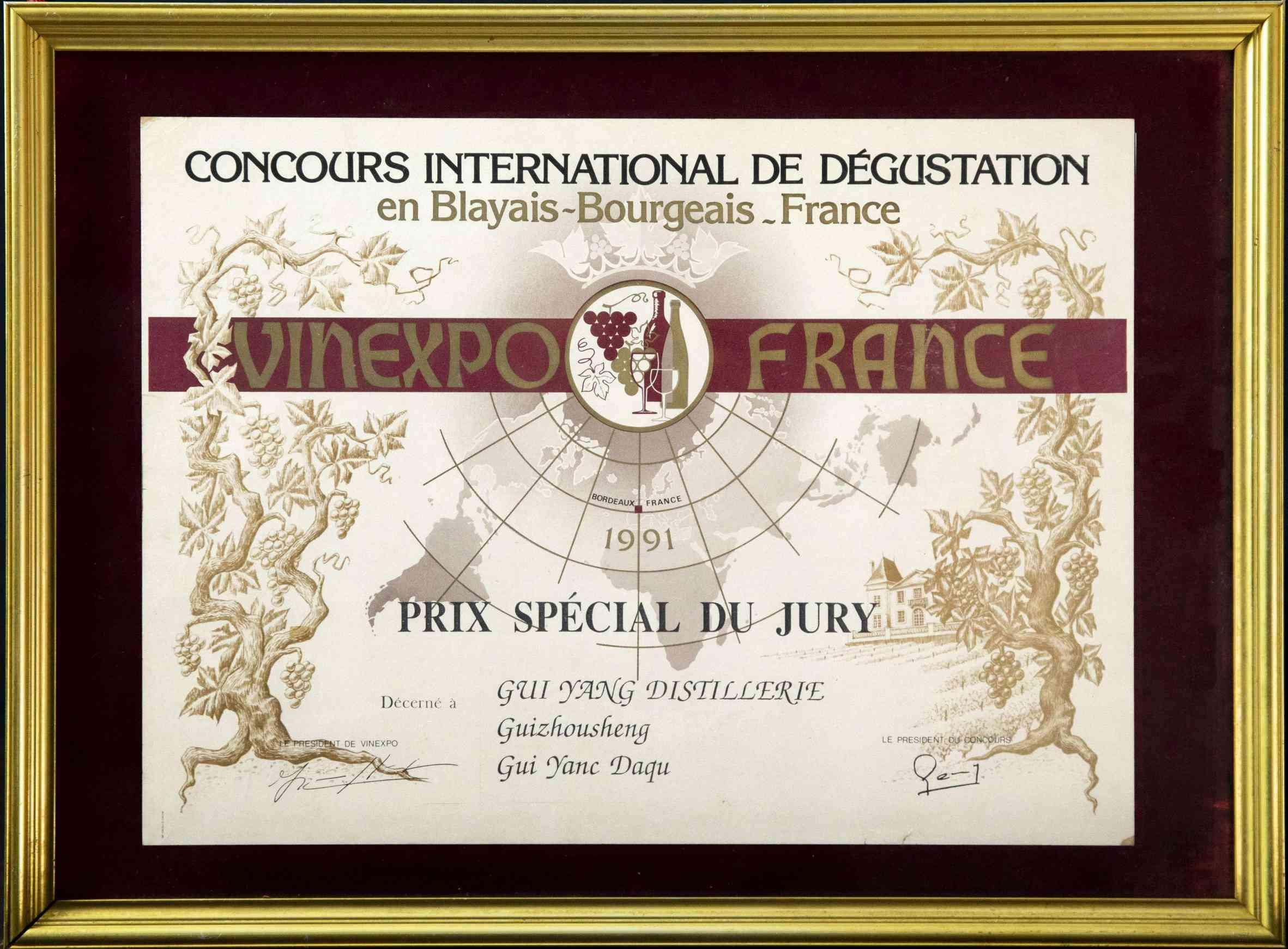 1991年法国波尔多国际酒类博览会“唯一特别奖”